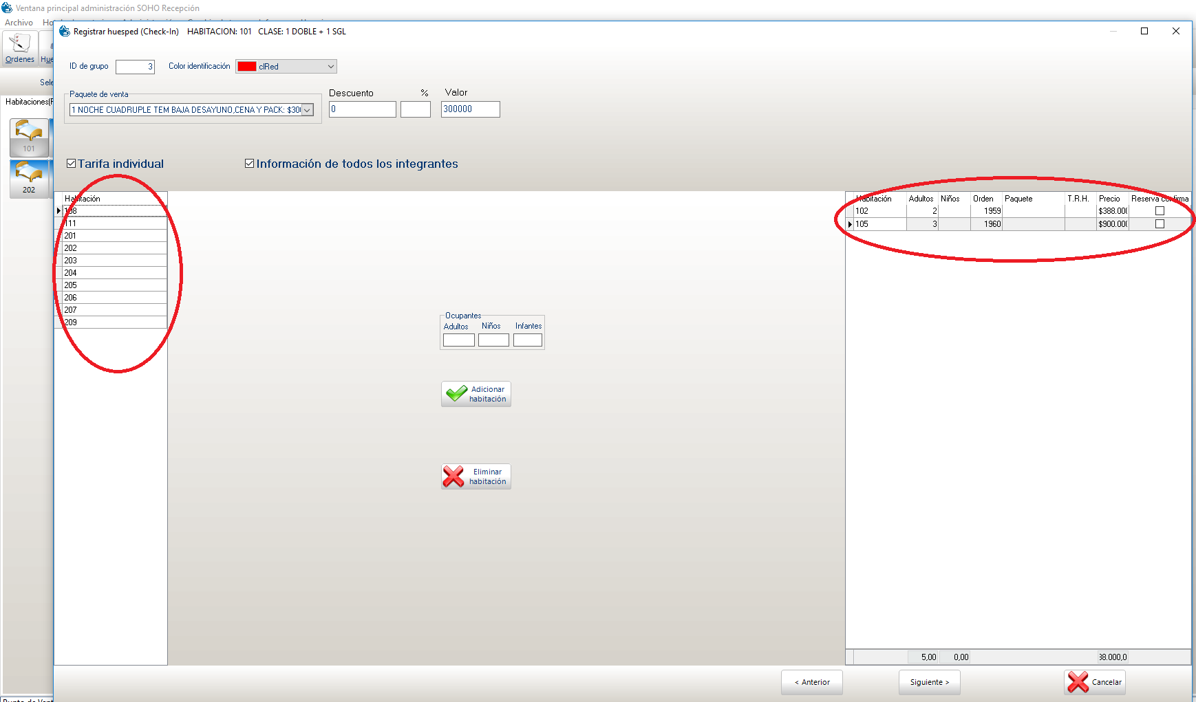 Grupo: Esta clase de huésped me indica que se va a ocupar varias habitaciones y la factura será a nombre de una sola persona o empresa, cuando se hace check in en grupo nos sale una ventana adicional donde se va registrando cada una de las habitaciones y se va añadiendo el paquete en cada uno y la cantidad de ocupantes. En esta opción podemos dar un color para identificar el grupo y el sistema también genera un id para el grupo.
