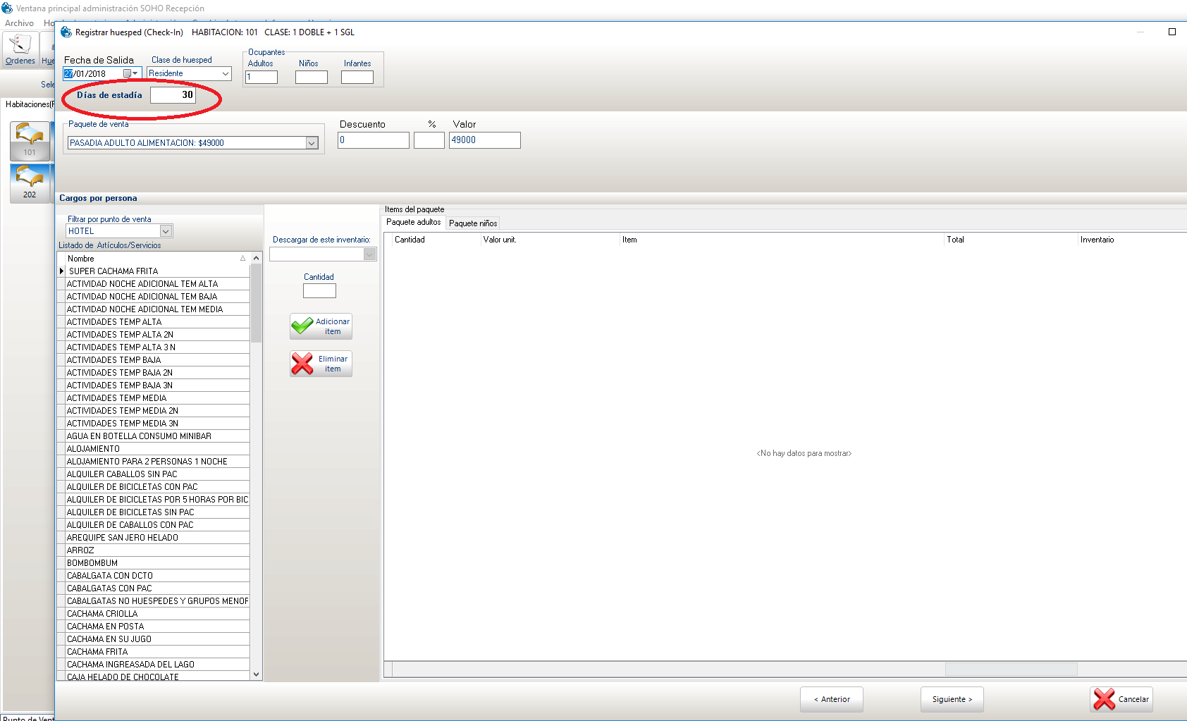 Residente: Esta clase de huésped es la que se aloja por un periodo de tiempo largo en el hotel, cuando se hace check in la diferencia es que sale un campo donde digitamos el número de días.